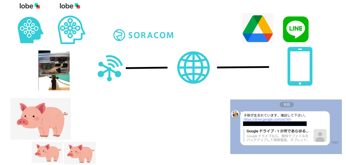 子豚の出産の時期になると出産時の事故を防ぐために夜中に起きて確認が必要な場合もあるらしく、とても大変であるという話を聞いたので、ラズパイとSORACOMを使って子豚の定期チェックと出産通知を行うシステムを作ってみました