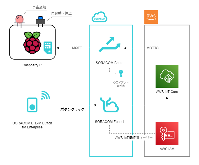 ― クラウド側の構成において、ボタンからのデータ伝達用として「クラウドアダプタ ― SORACOM Funnel」を、そしてLED制御を担うラズパイへのプッシュ送信をAWS IoT Coreというゲートウェイサービスと「データ転送 ― SORACOM Beam」によるMQTT通信の組み合わせで実現しているのは、各サービスの特性を100%活かせていると感じました。