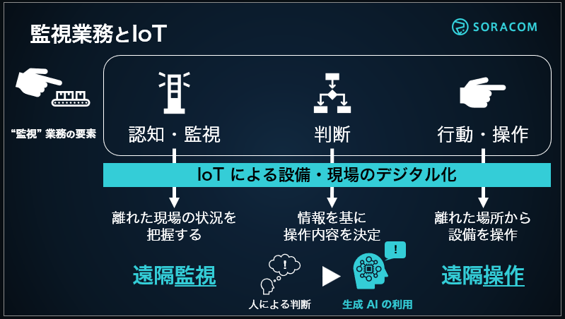 IoT は監視業務において、特に(狭い意味での)監視や行動で遠隔化を実現できます。また、監視で得られた情報を判断材料にもできるわけです。