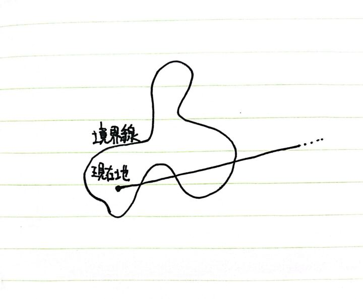 判別方法としては、レイキャスト法と呼ばれるものでエリアの境界と現在地を適当に決めます。(下図)