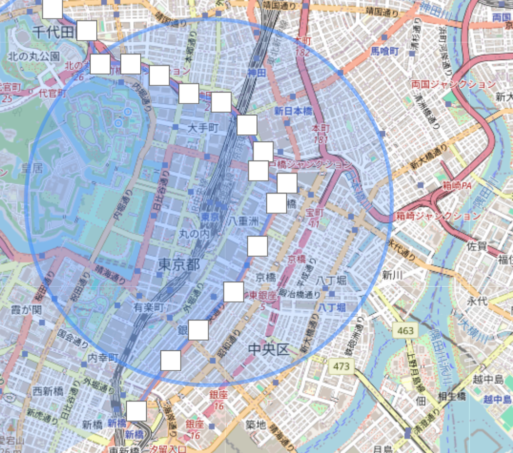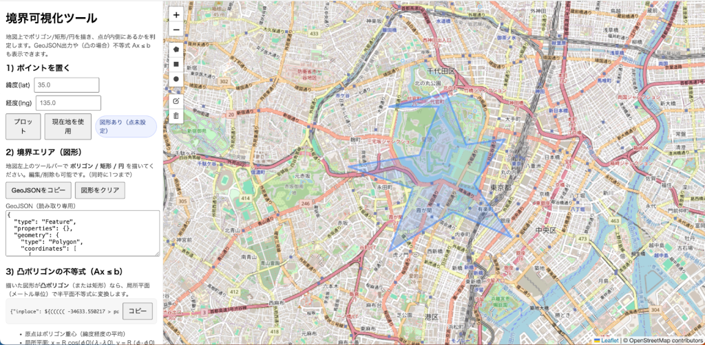 ChatGPT に html 形式でツールを作らせました。以下の画像のように、頂点指定、四角、円形の三種類でエリアの境界を作ることができます。