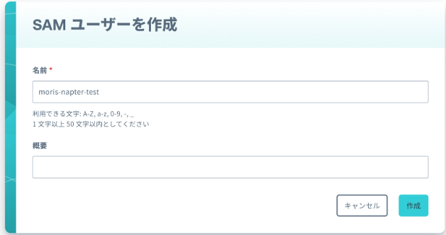 「SAMユーザーを作成」というモーダルダイアログが表示されますので、名前欄に適当な名前を入力し、「作成」ボタンをクリックしてSAMユーザーを作成しましょう。