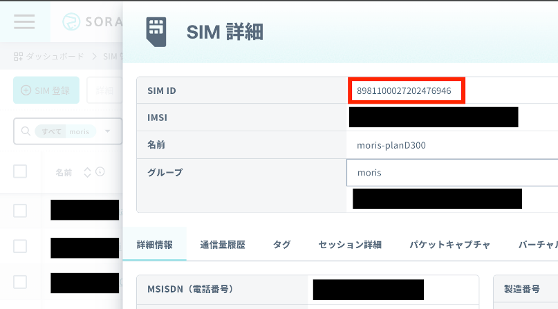 ユーザーコンソールのSIM一覧画面から、対象となるSIMの名前をクリックし、展開されるSIM詳細画面からSIM IDを確認します。また、SIMの名前もメモしておきましょう。