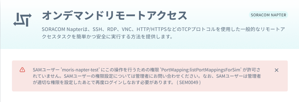 次は別のSIMにリモートアクセスを作成してみましょう。オンデマンドリモートアクセスの作成画面で、以下のようなエラーが出るようになっています。これは、ロールに設定したパーミッション構文の condition フィールドで、このSIMに対しては PortMapping の権限が与えられないように設定されているからです。