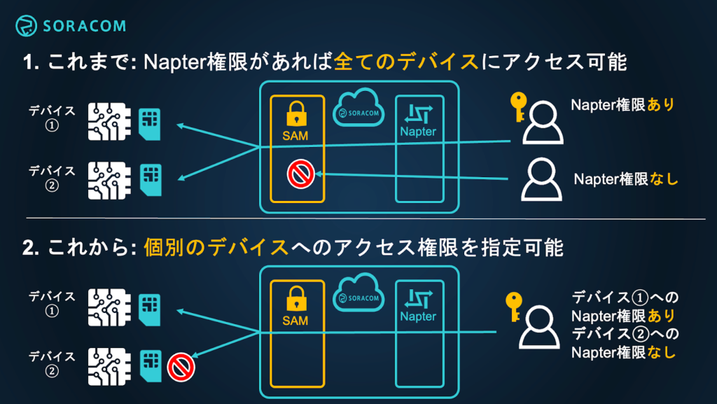 下記の図をご覧ください。これまでのユーザーコンソールと従来のAPIでは、 「1. これまで」のようにSORACOM Napterの権限を持つSAMユーザーであれば、そのオペレータの全てのデバイスにリモートアクセスが可能でした。