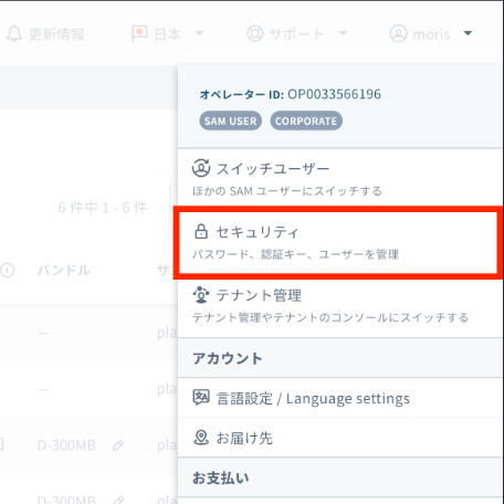 次にSAMロールを作っていきます。ユーザーコンソール右上のSAMユーザー名をクリックし、表示されるメニューから「セキュリティ」を選択します。権限設定の詳細な手順については こちら をご確認ください。