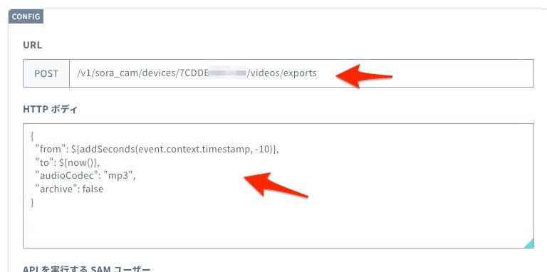 <device_id>には、対象となるソラカメのデバイス ID に置き換えてください。${payload.exportId}は、ステップ2 のAPIレスポンスに含まれるエクスポートIDを参照しています。Flux が SORACOM API を呼び出すときに置き換えるのでそのまま${payload.exportId}を記載してください。 SORACOM Flux では、前のアクションの出力がpayloadという変数に格納され、その中の値を${payload.キー名}で参照できます。