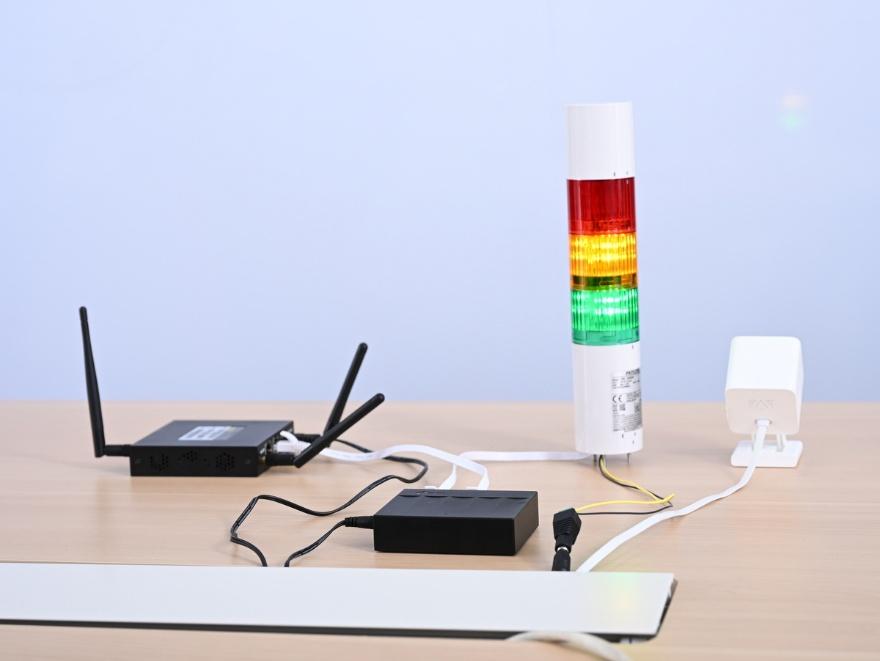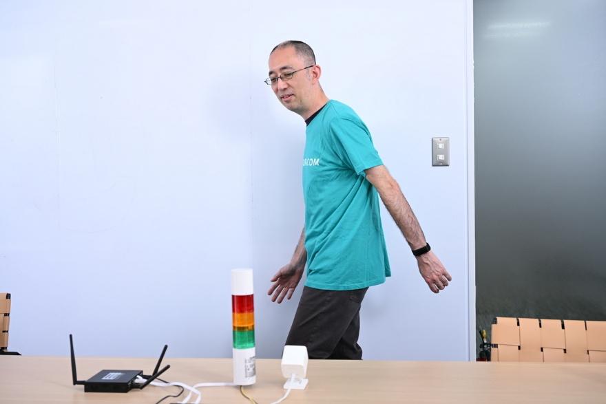 デモで披露されたのは、SORACOMの水色Tシャツを着た人がカメラの前を通ると、信号灯がアラートを挙げるというデモ。ソラカメがモーション検知で、通過中を撮影し、画像を切り出してAIで画像解析。水色のTシャツを検出すると、SIM搭載コントローラーを介して、信号灯に接点信号を送るという仕組み。SORACOMからSIMが搭載されているデバイスへの指示に、ダウンリンクAPIが利用されている。