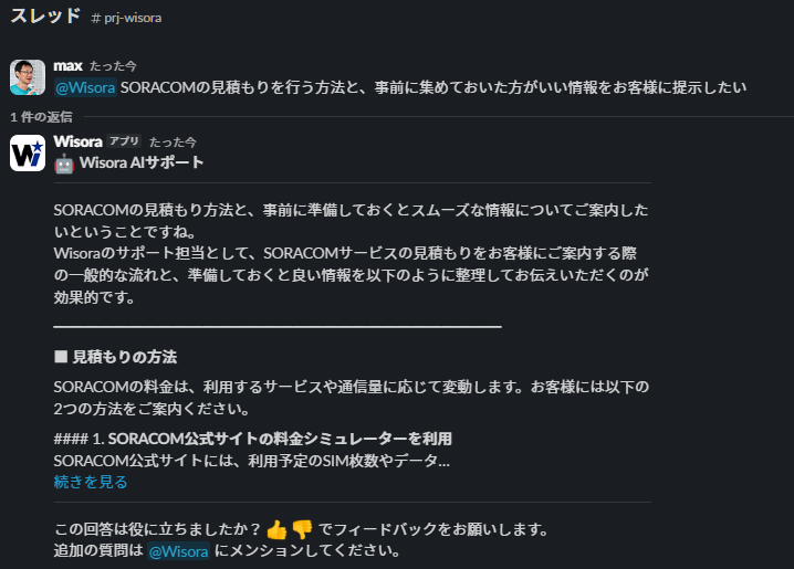 <コミュニケーションツールへの組み込み> これまで紹介したウェブページとは異なり、Slack や Microsoft Teams といったサービス上で、 AI チャットボットが1人のユーザーのように振舞う形態です。チャットボットにメンションと共に質問を送ったり、特定のチャンネルで質問をすると回答が返ってくる利用方法となります(下図はソラコムの AI チャットボットサービス「Wisora」に対して Slack 上でメンションを送った例)。