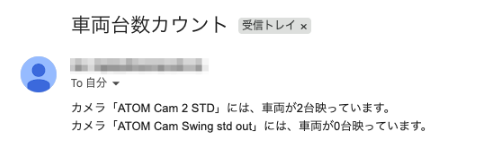 このメール通知の例では、カメラ2台にそれぞれ映っている車両台数をAIでカウントして、1通のメールにまとめて通知しています。