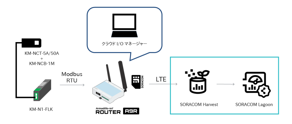Modbus RTU対応の小型電力量モニタ「KM-N1-FLK」とCT(変流器)をArmadillo-IoTルーター A9RのRS-485端子に接続し、クラウドI/Oマネージャーでレジスタアドレス(取得するデータの位置)をWeb UIから設定することで、電圧・電流データをSORACOM Harvest Dataへ定期送信できます。